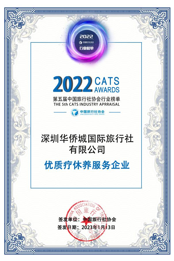 日前,中國旅行社協(xié)會發(fā)布第五屆中國旅行社協(xié)會行業(yè)榜單,華僑城旗下華僑城旅行社再次入選“旅行社品牌20強”,并榮獲“優(yōu)質(zhì)療休養(yǎng)服務(wù)企業(yè)”獎項,企業(yè)綜合實力再獲行業(yè)認可。.