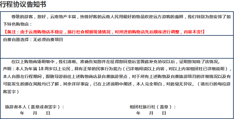 1、報(bào)價(jià)只含每人每天一床位,如產(chǎn)生單男單女須補(bǔ)房差。2、行程內(nèi)沒有約定包含的景區(qū)內(nèi)交通費(fèi)用;行程外的自費(fèi)節(jié)目及私人所產(chǎn)生的個(gè)人費(fèi)用等。3、不含旅游意外險(xiǎn),貴重物品隨身攜帶或者入住酒店在前臺寄存,以免丟失,請注意保管好自己的財(cái)物,如有財(cái)物丟失,旅行社不承擔(dān)責(zé)任。4、由于不可抗力或者旅行社、履行輔助人已盡合理義務(wù)仍無法避免的事件,而需要變更行程時(shí)產(chǎn)生的費(fèi)用(包括但不限于自然災(zāi)害、航班延誤或取消、車輛故障、交通意外等)。5、其他未約定由組團(tuán)社支付的費(fèi)用(包括節(jié)假日旺季升幅、機(jī)場內(nèi)候機(jī)和轉(zhuǎn)機(jī)的餐食、不可抗力因素所產(chǎn)生的額外費(fèi)用等)。6、客人若中途自愿離團(tuán),旅行社扣除實(shí)際產(chǎn)生費(fèi)用后,將未產(chǎn)生費(fèi)用余款退還,給旅行社造成損失的,旅游者應(yīng)當(dāng)依法承擔(dān)賠償責(zé)任。自愿簽字離團(tuán)后一切責(zé)任與旅行社無關(guān)。