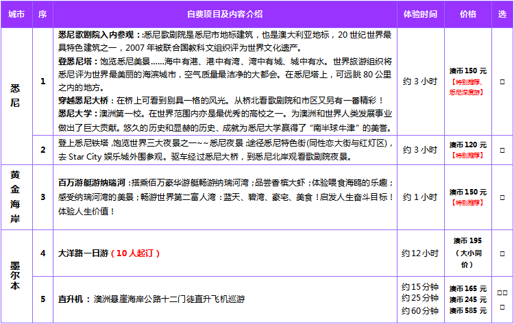 衣著:澳洲新西蘭各地著裝隨意,客人再準(zhǔn)備著裝的時(shí)候請根據(jù)出發(fā)時(shí)的氣候和自身身體條件調(diào)整所帶服裝,最好以輕便著裝為主,減輕旅途的負(fù)擔(dān)。