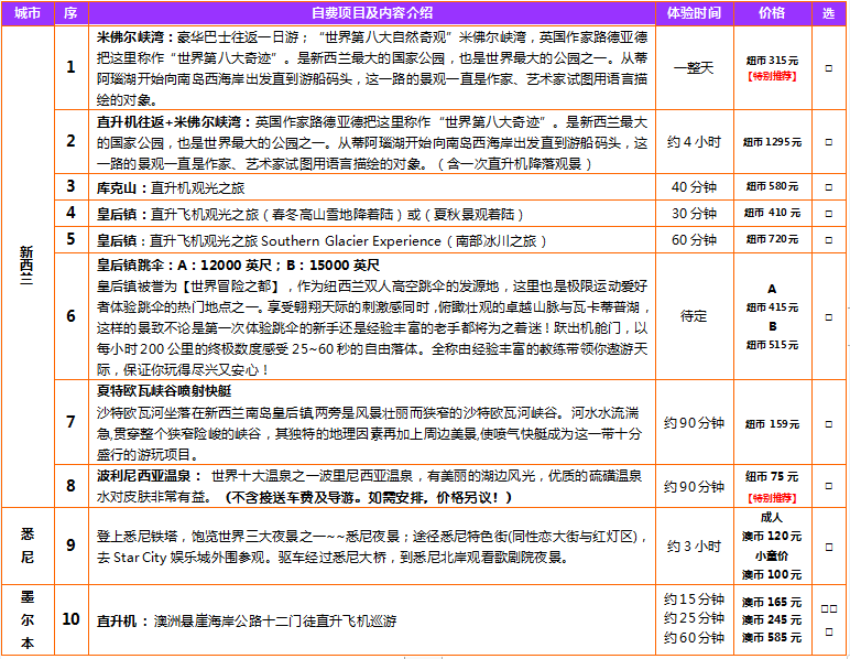 衣著:澳洲新西蘭各地著裝隨意,客人再準(zhǔn)備著裝的時(shí)候請(qǐng)根據(jù)出發(fā)時(shí)的氣候和自身身體條件調(diào)整所帶服裝,最好以輕便著裝為主,減輕旅途的負(fù)擔(dān)。